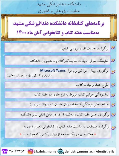 اخبار كتابخانه بازدید: 199 مروری بر اهم فعالیت های کتابخانه دانشکده در هفته کتاب و کتابخوانی آبان ماه 1400