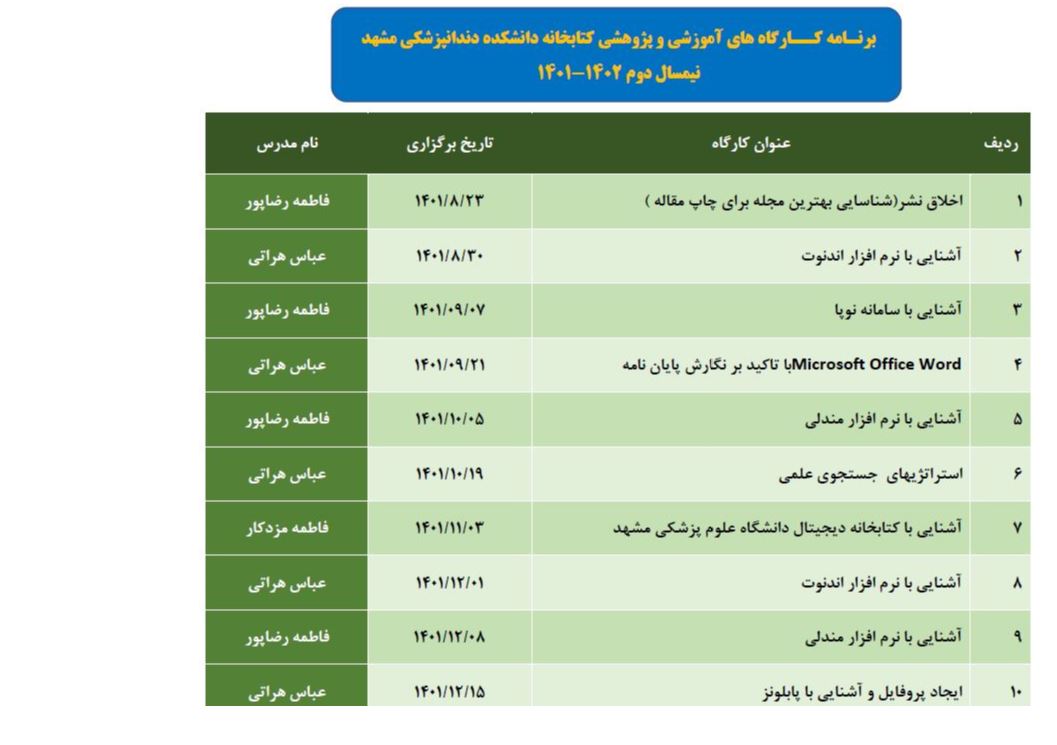 برنامه کارگاه های آموزشی پژوهشی کتابخانه نیمسال دوم 1402-1401